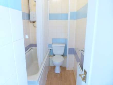 Three piece white suite, shower over bath, fully tiled ceramic walls.